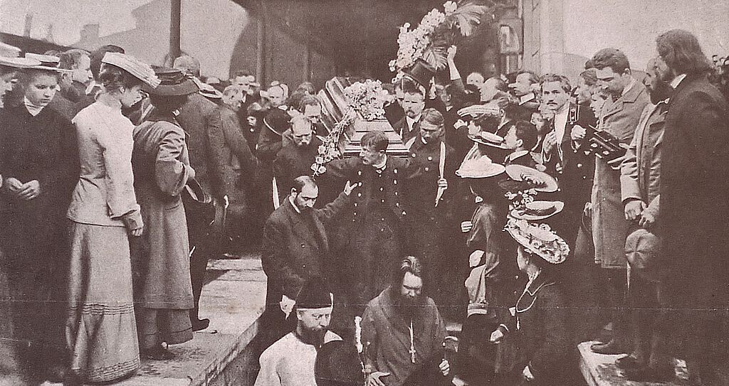 Сегодня Москва хоронила Чехова. С Николаевского вокзала до Новодевичьего монастыря гроб несла на руках молодежь. Зато в Петербурге отличились. Встретить прах Чехова собралось человек 15-20. Гроб прибыл в товарном вагоне для провозки свежих устриц (!). Не было ни священника, ни певчих. По «счастливой случайности» в это же время прибыло из-за границы тело генерала Обручева, которого дожидалось на вокзале блестящее общество. Встречавшие тело Чехова упросили священника и певчих отслужить литию и у вагона «для устриц», приютившего Антона Павлыча. Из «блестящего общества» отделился только один человек, министр кн. Хилков, подошедший поклониться праху знаменитого писателя.