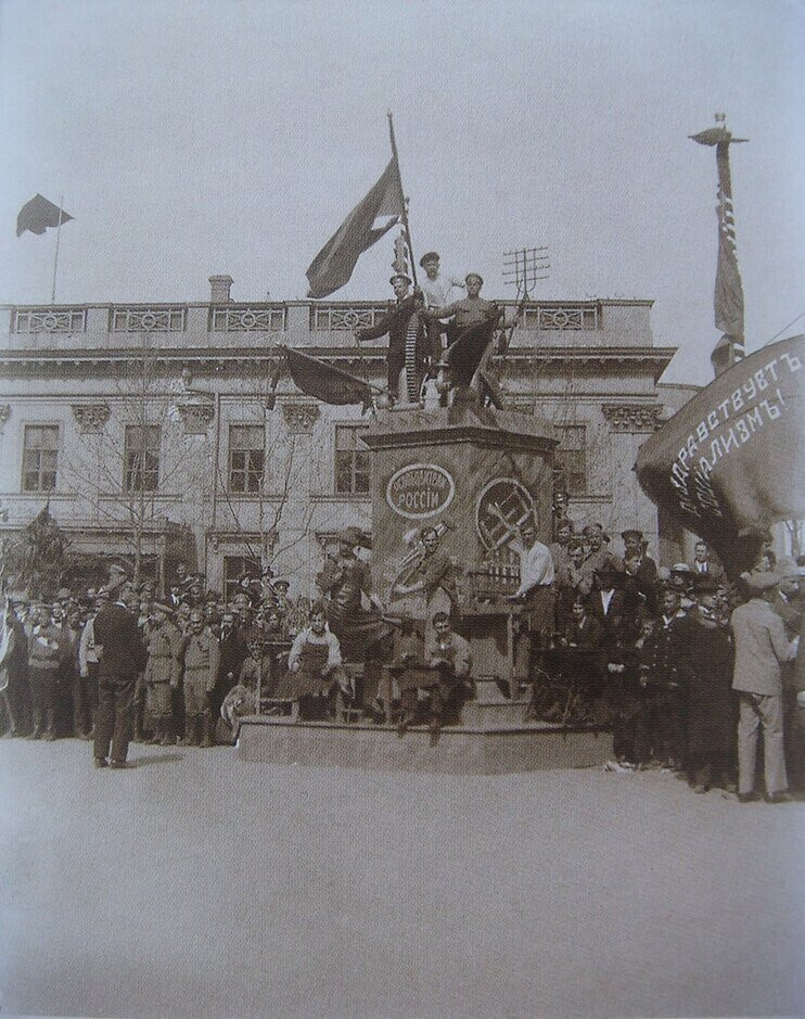 На Думской площади люди висели даже на фонарях и поднялись на крышу. Посреди площади высилась трибуна с живой картиной: на станке красивый типичный рабочий в синей блузе, слева матрос с винтовкой, справа солдат с тремя «Георгиями». Внизу стояла надпись: «Спасители Родины». Стояли они как изваяния, а внизу полоскались красные флаги с золотой бахромой.