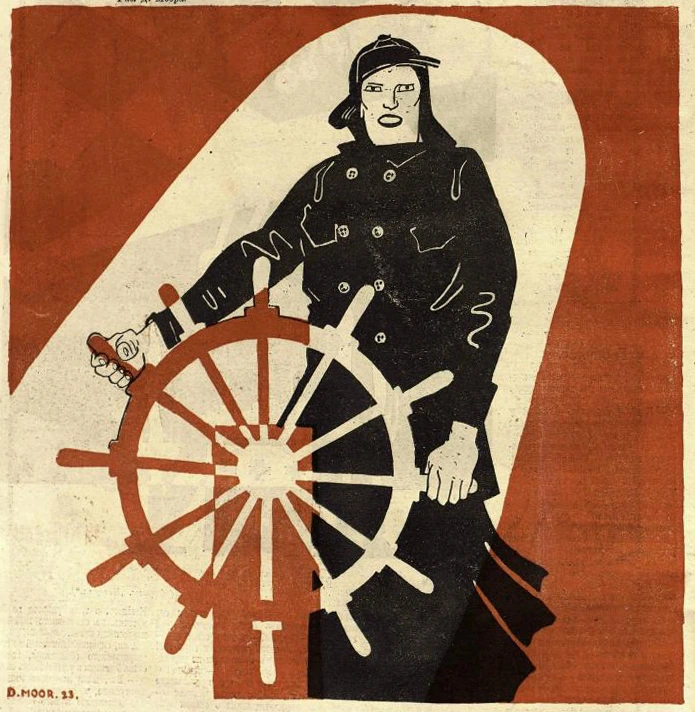 Женщина — к рулю! (К международному дню работниц.) «Ум короток — долог волос» — Это ложь и клевета! Те, кто в поле режет колос, Кто героев воспитал; Кто на фабриках, заводах, В час разгула вражьих сил, Позабывши краткий отдых, Для борьбы снаряды лил; Кто помог ненастной ночью Вспыхнуть утру Октября, — Женщины! Вставайте прочно У советского руля. Вам в работе честь и место, Все дороги, все права! Вам придется ставить тесто На всемирный каравай. Рис. Д. Моора. «Крокодил», 1923, № 10.Целый мир открыт для «бабы», целый мир — бери и жуй. Только муж вот вроде жабы, несознательный буржуй.