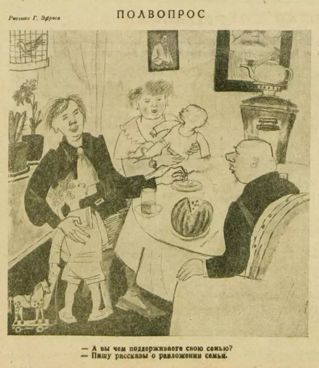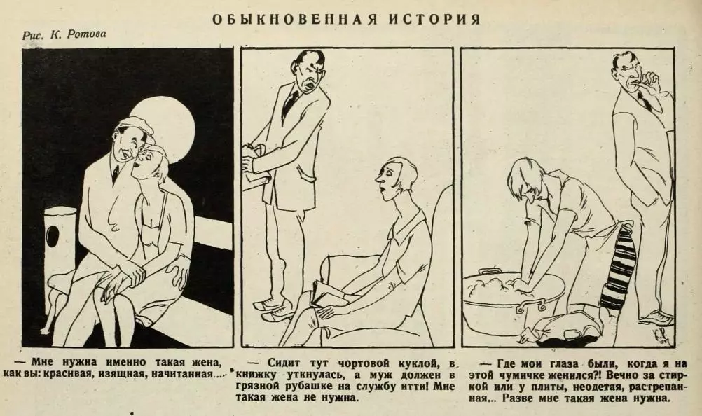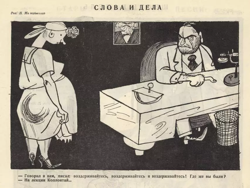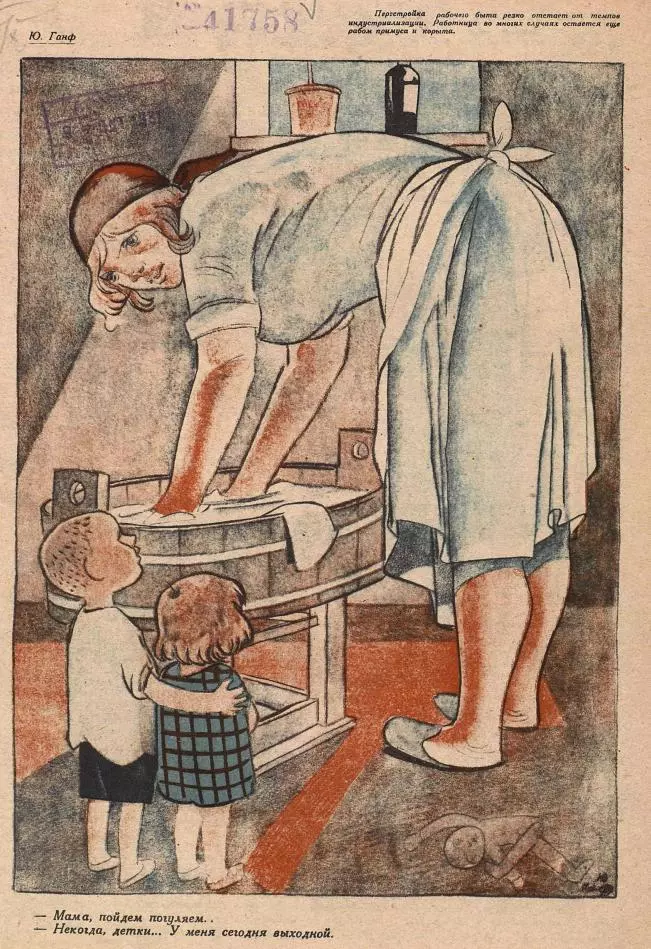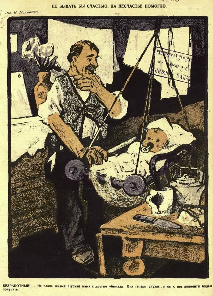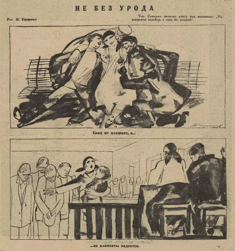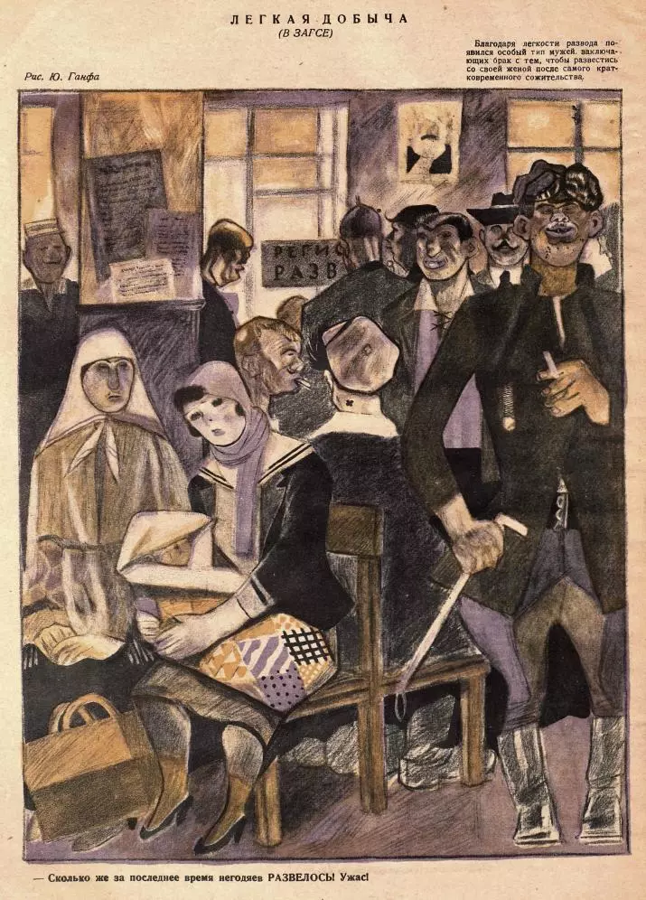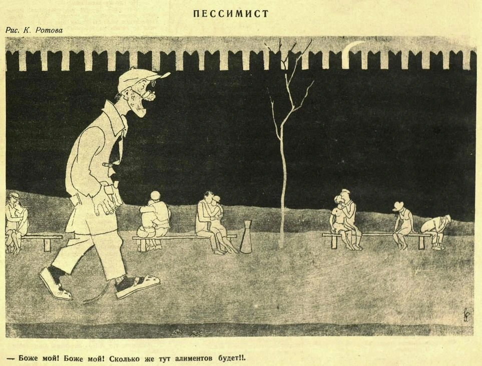 На деле отношение ко всем этим свободам в обществе — даже среди искренних сторонников советской власти — было двойственным. Как видно даже из сюжетов карикатур, большинство продолжало ценить традиционную, стабильную семью (при условии, что она живет «новым бытом», о чем мы поговорим в следующем эпизоде) и порицать тех, кто злоупотреблял новыми возможностями, пусть и не нарушая буквы закона, — причем это касалось как мужчин, так и женщин. Советское руководство тоже было вынуждено лавировать между «раскрепощением» с его матримониальными и сексуальными свободами с одной стороны — и демографическим кризисом после Гражданской войны, эпидемий и массовой эмиграции с другой. Именно последними соображениями было вызвано ограничение абортов и появление инициатив (не сразу реализованных) типа налога на бездетность.