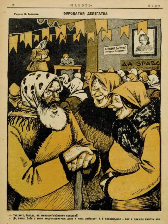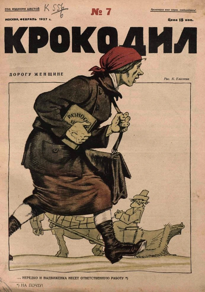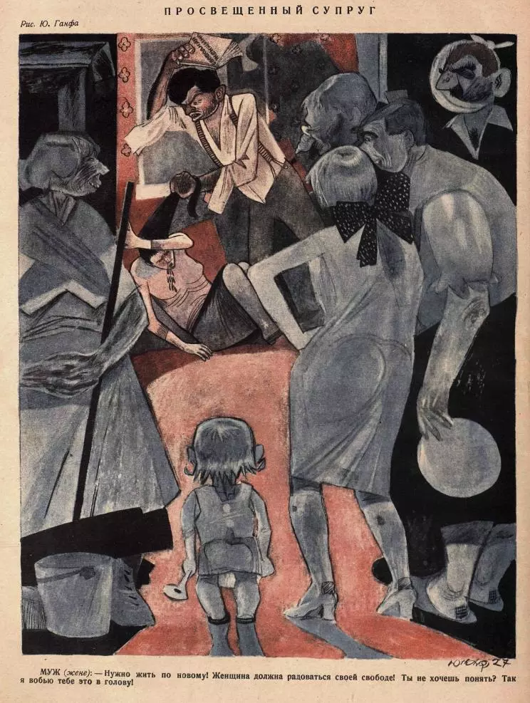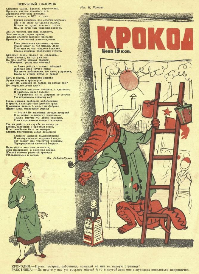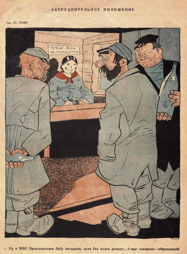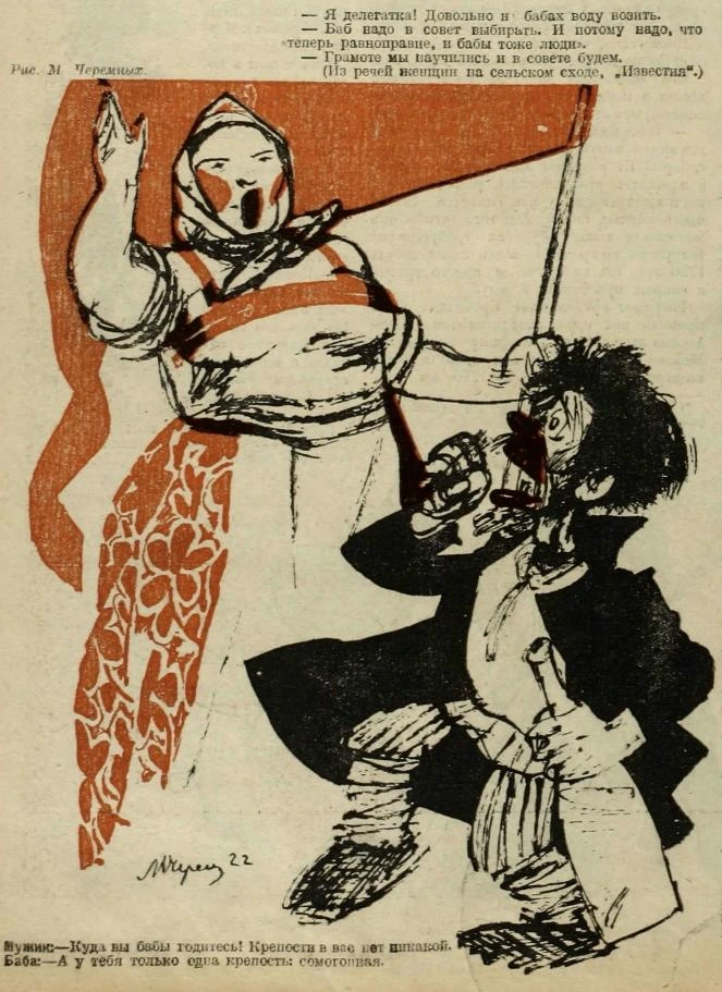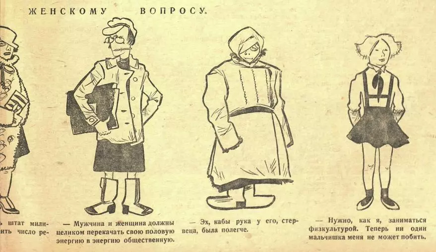 Как это часто бывало и со многими другими амбициозными проектами большевиков, «раскрепощение женщины» часто оборачивалось, с одной стороны, принуждением, а с другой — показухой, что наглядно иллюстрируют карикатуры. Эти карикатуры мы отобрали из двух самых популярных сатирических журналов того времени — московского «Крокодила» и ленинградского «Смехача». Оба они родились в начале 1920-х годов и использовались властью в качестве инструмента пропаганды, высмеивая остатки «старого мира» и уродливые явления мира нового — религию, побежденные классы, врагов советской власти, бюрократов, взяточников, растратчиков и так далее. Что касается «женского вопроса», то предметом сатиры становятся, с одной стороны, несознательные женщины и противящиеся новым установкам по «женскому вопросу» мужчины, а с другой — наоборот, «перегибы» в деле раскрепощения.