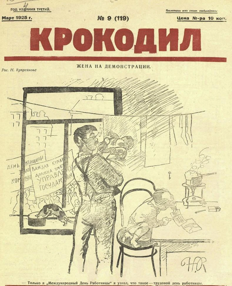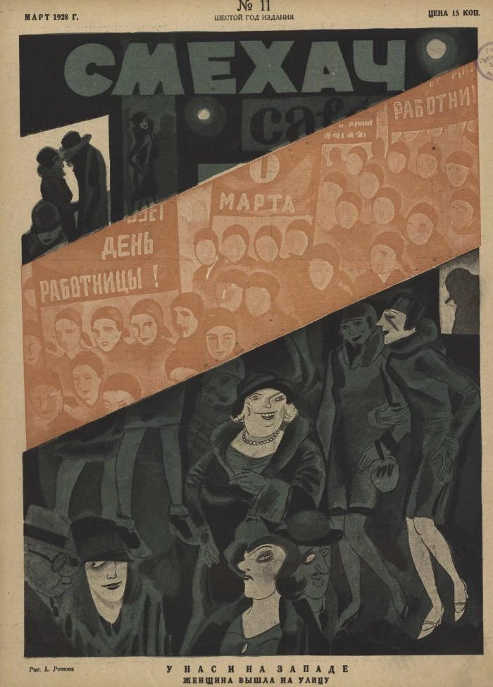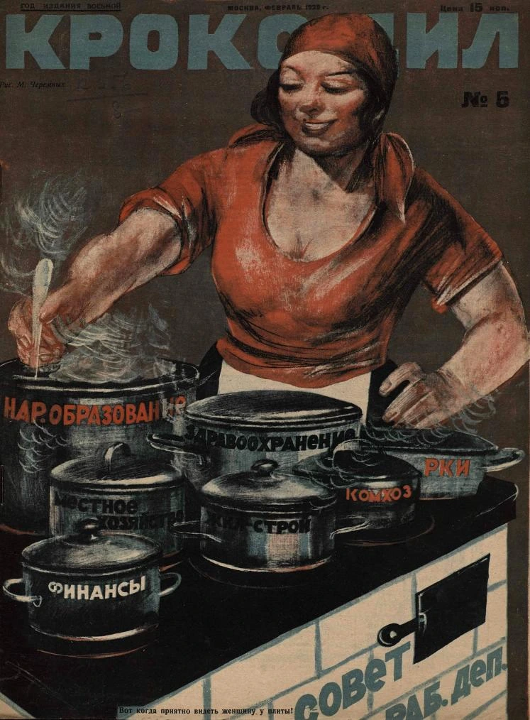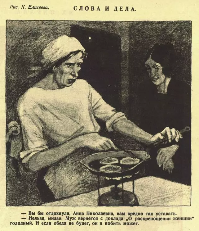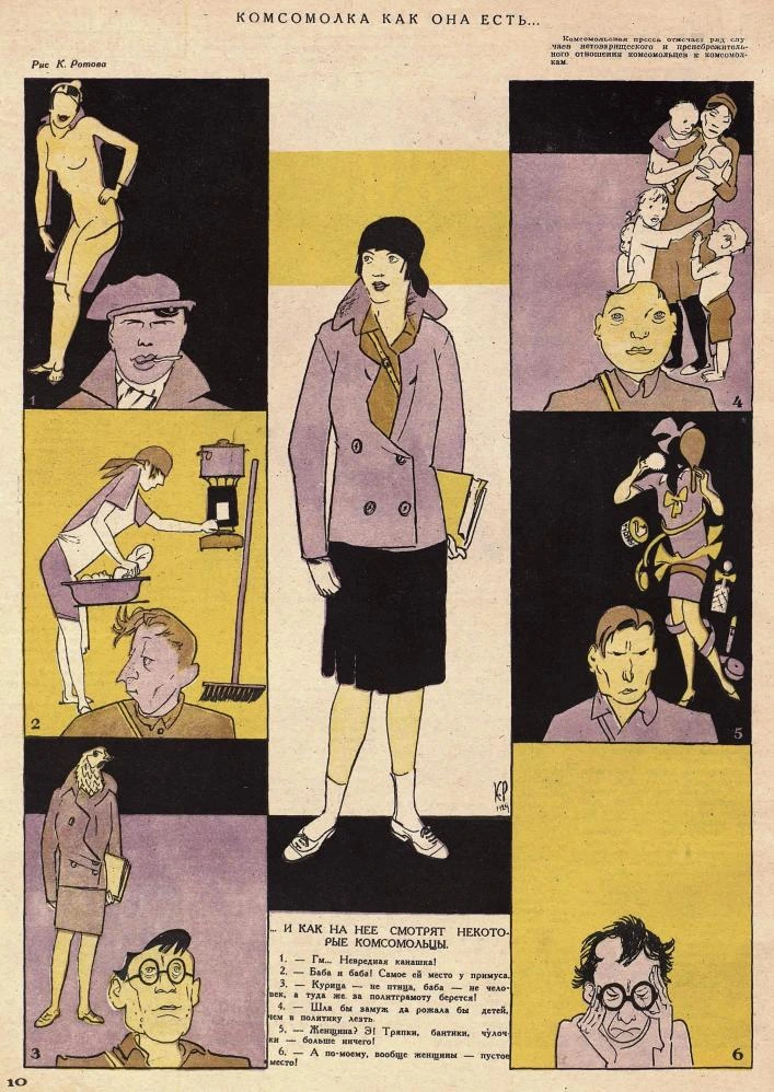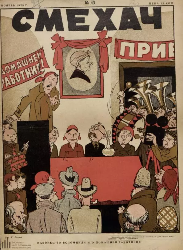 Как это часто бывало и со многими другими амбициозными проектами большевиков, «раскрепощение женщины» часто оборачивалось, с одной стороны, принуждением, а с другой — показухой, что наглядно иллюстрируют карикатуры. Эти карикатуры мы отобрали из двух самых популярных сатирических журналов того времени — московского «Крокодила» и ленинградского «Смехача». Оба они родились в начале 1920-х годов и использовались властью в качестве инструмента пропаганды, высмеивая остатки «старого мира» и уродливые явления мира нового — религию, побежденные классы, врагов советской власти, бюрократов, взяточников, растратчиков и так далее. Что касается «женского вопроса», то предметом сатиры становятся, с одной стороны, несознательные женщины и противящиеся новым установкам по «женскому вопросу» мужчины, а с другой — наоборот, «перегибы» в деле раскрепощения.