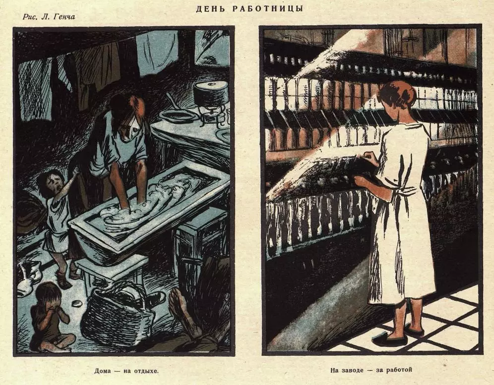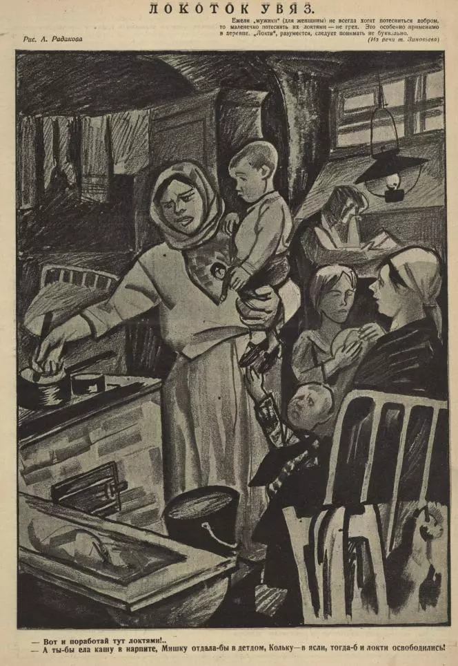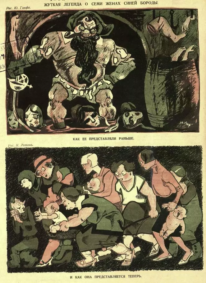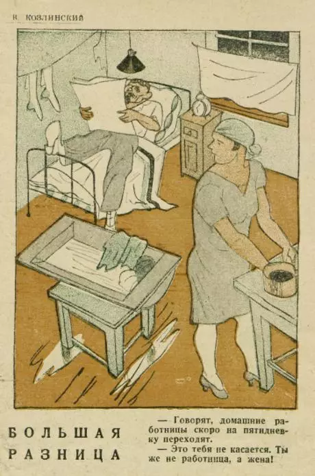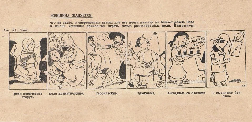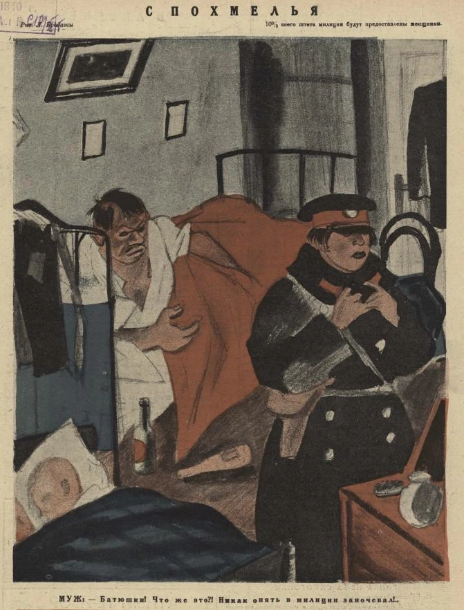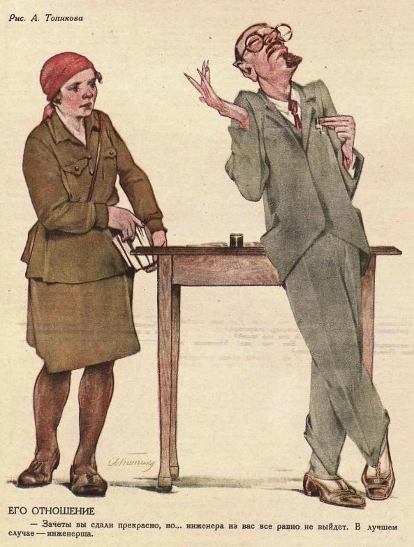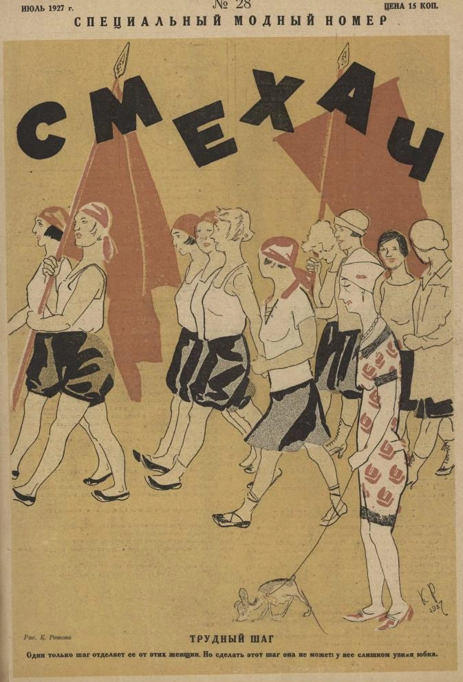 Как это часто бывало и со многими другими амбициозными проектами большевиков, «раскрепощение женщины» часто оборачивалось, с одной стороны, принуждением, а с другой — показухой, что наглядно иллюстрируют карикатуры. Эти карикатуры мы отобрали из двух самых популярных сатирических журналов того времени — московского «Крокодила» и ленинградского «Смехача». Оба они родились в начале 1920-х годов и использовались властью в качестве инструмента пропаганды, высмеивая остатки «старого мира» и уродливые явления мира нового — религию, побежденные классы, врагов советской власти, бюрократов, взяточников, растратчиков и так далее. Что касается «женского вопроса», то предметом сатиры становятся, с одной стороны, несознательные женщины и противящиеся новым установкам по «женскому вопросу» мужчины, а с другой — наоборот, «перегибы» в деле раскрепощения.