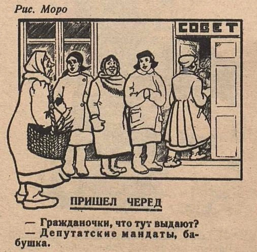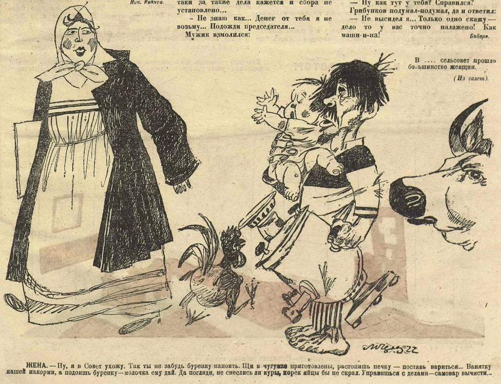 Рис. М. Черемных. «Крокодил», 1922, № 15.В … сельсовет прошло большинство женщин. (Из газет.)