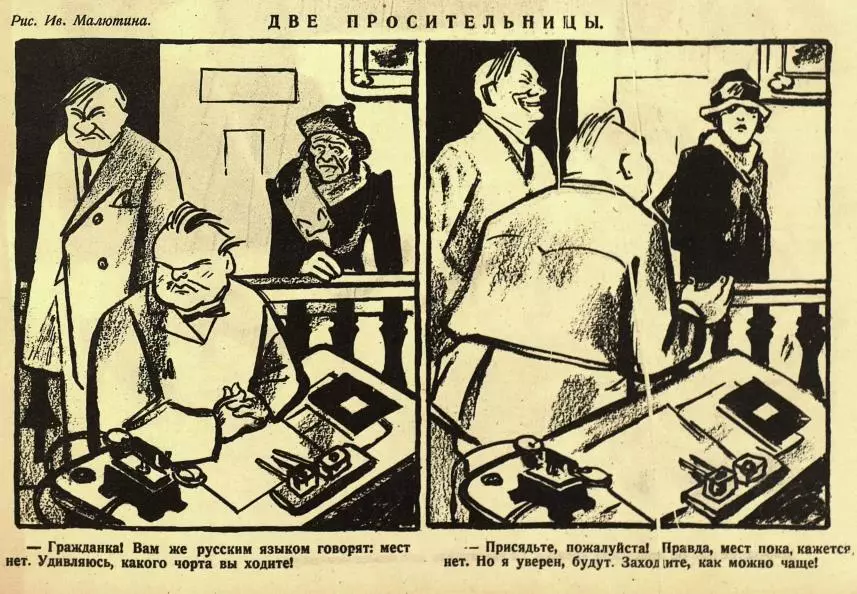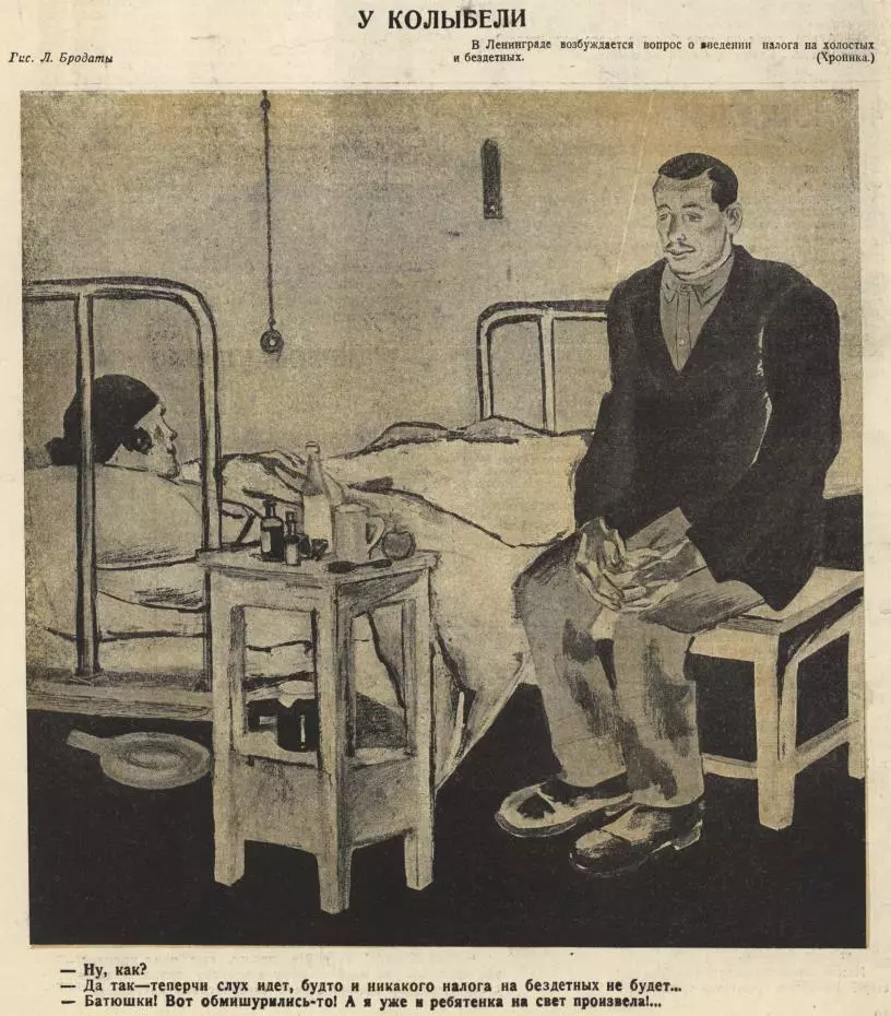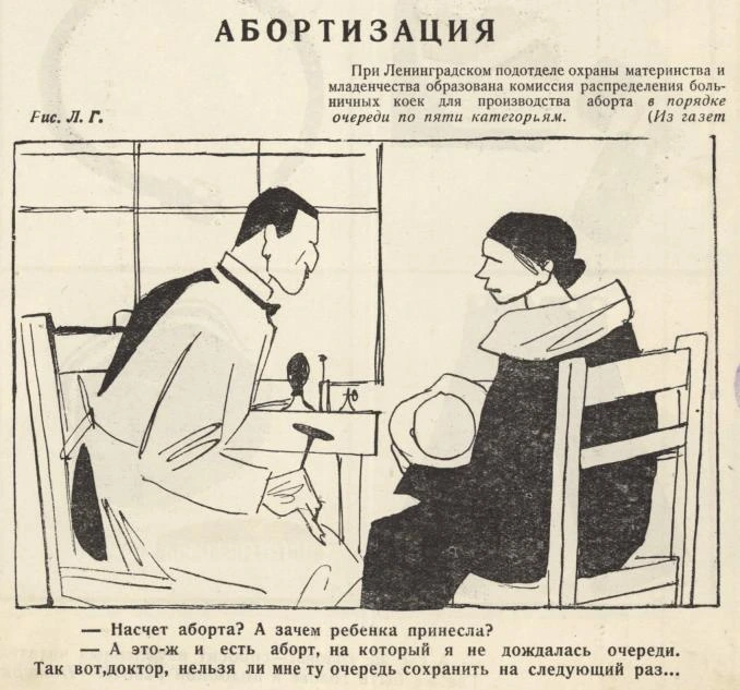 При Ленинградском подотделе охраны материнства и младенчества образована комиссия распределения больничных коек для производства аборта в порядке очереди по пяти категориям. (Из газет.)