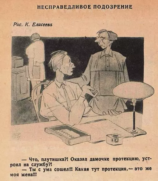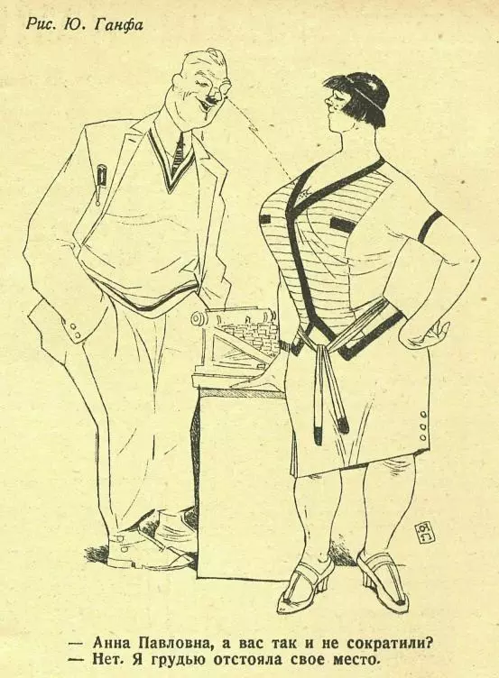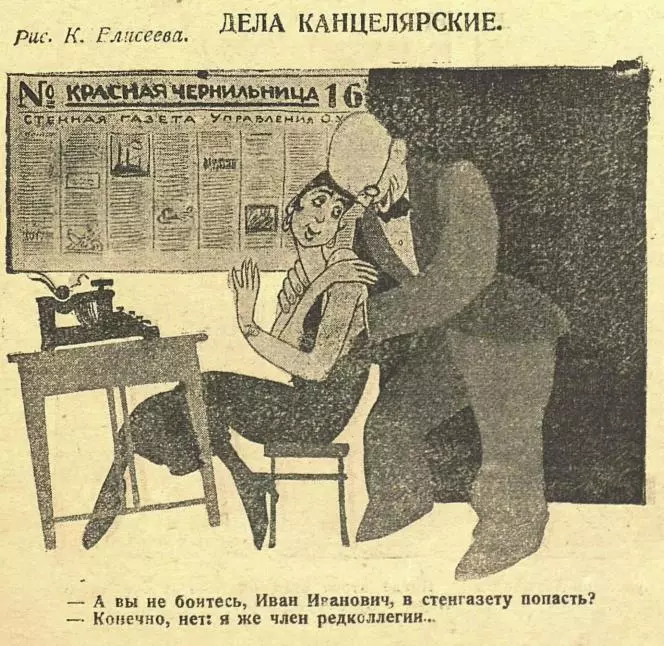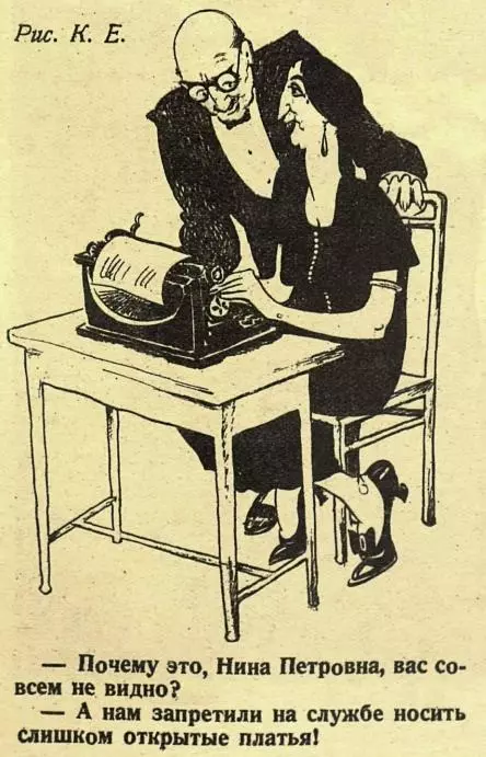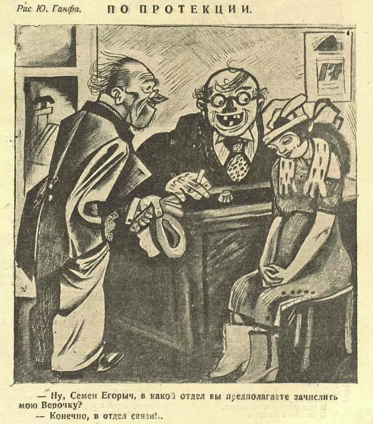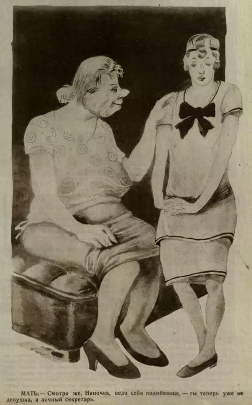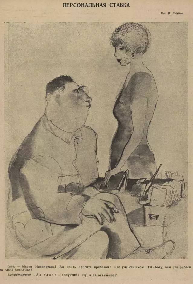 Достижения советской власти часто приводили к возникновению новых проблем. Например, полное открытие рынка труда для женщин и их активная мобилизация на производство и в советские учреждения — за счет отказа от «старого быта» — увенчались к середине 1920-х годов успехом: женщин стало значительно больше везде. Впрочем, в основном это были молодые девушки, поэтому руководящие посты они занимали нечасто. Если говорить об учреждениях, то советская бюрократия разрасталась бурными темпами, быстро затмив по своим масштабам бюрократию дореволюционную. Строгая иерархичность способствовала злоупотреблениям. Главным из них было «кумовство» — практика найма и карьерного продвижения (без учета интересов службы) жен, братьев, сестер, их супругов и других близких и дальних родственников. А своеобразной разновидностью кумовства было аналогичное покровительство, оказываемое мужчинами-начальниками подчиненным «хорошеньким» девушкам — разумеется, не бескорыстно. Более того, этот «административный ресурс» мог становиться орудием принуждения — несговорчивых или их родственников всегда можно было сократить. Как все мы хорошо знаем, эти практики надолго пережили СССР, да и в западных странах они до самого последнего времени использовались с не меньшим энтузиазмом. Интересно, что карикатуристы 1920-х (исключительно мужчины), выставляя советских бюрократов-сластолюбцев в сатирическом свете, делают это довольно добродушно. Более того, нередко сатирическое перо направлено в сторону самих женщин, строящих карьеру «через постель».