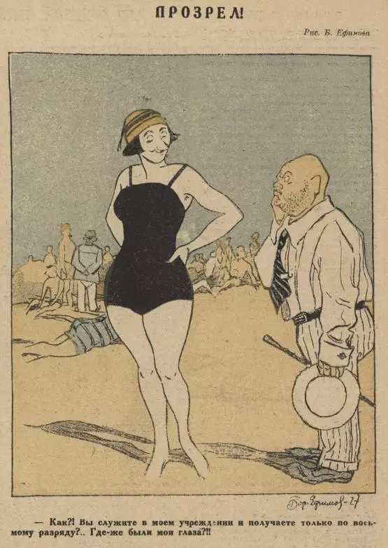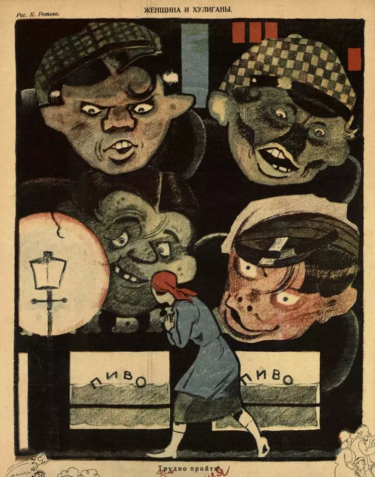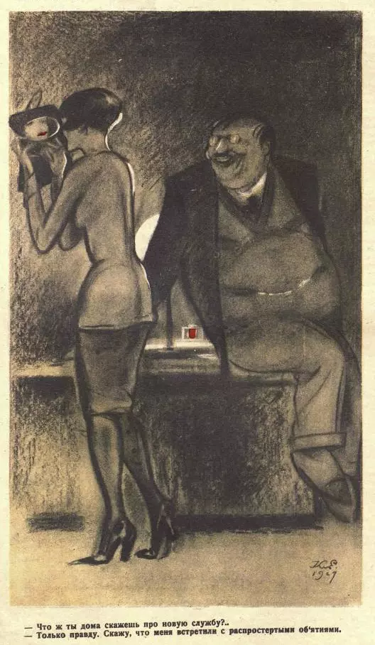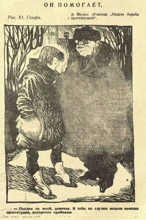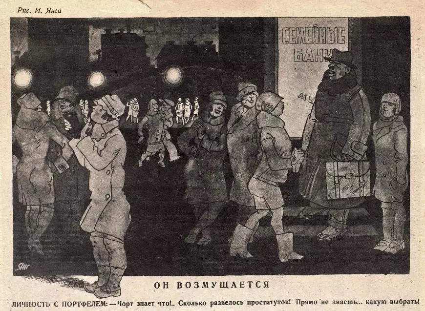 Еще одной темой для сатиры стало общественное явление, которое очень раздражало советское руководство, — проституция. Ведь, казалось бы, она должна была немедленно исчезнуть, когда женщина раскрепостилась, получив все права и свободы. Однако в действительности проституция в больших городах стала, наоборот, гораздо более распространенным явлением, чем до 1917 года. Этому способствовало много факторов — в частности, обнищание населения и значительный приток в города деревенской молодежи. В конце 1919 года была создана Комиссия по борьбе с проституцией при Наркомате здравоохранения, а затем Межведомственная комиссия по борьбе с проституцией при Наркомате соцобеспечения. Но административные меры не помогали: по данным опросов, в 1923 году услугами проституток пользовалось от 40% до 60% взрослых мужчин в городах. Поначалу самих женщин (в отличие от виновных в сводничестве и притоносодержании) не преследовали, поскольку они считались «жертвами капиталистических предрассудков». Только начиная с 1928–1929 годов особо «злостных» стали в административном порядке направлять в контролируемую НКВД систему «специальных учреждений принудительного трудового перевоспитания» — артелей, мастерских открытого типа, полузакрытых трудпрофилакториев и загородных колоний специального режима. В годы Большого террора эти учреждения стали частью ГУЛАГа, а самих проституток иногда осуждали по политическим статьям — как классовых врагов. При этом тема проституции полностью исчезла со страниц прессы, в том числе сатирической. Проституция в СССР официально — но не в реальной жизни, разумеется, — перестала существовать.