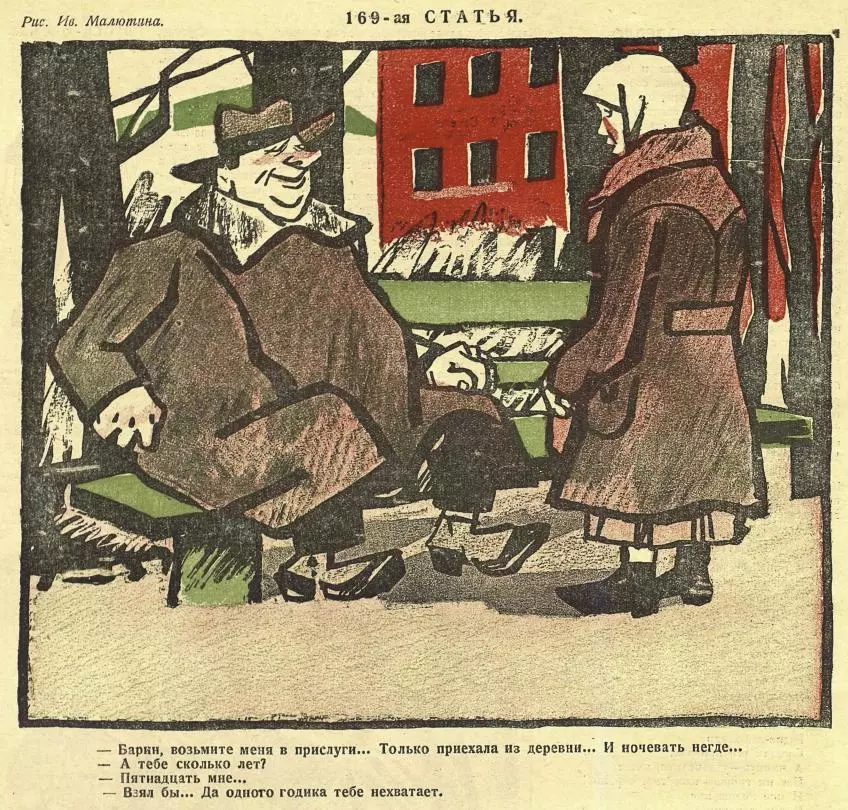 *Статья 169 УК РСФСР 1922 года предусматривала уголовную ответственность («лишение свободы на срок не ниже трех лет») за изнасилование. Вероятно, автор карикатуры ошибся, имея в виду статью 166 — «половое сношение с лицами, не достигшими половой зрелости», — которая предусматривала тот же минимальный срок, но «со строгой изоляцией».ОН ПОМОГАЕТ.