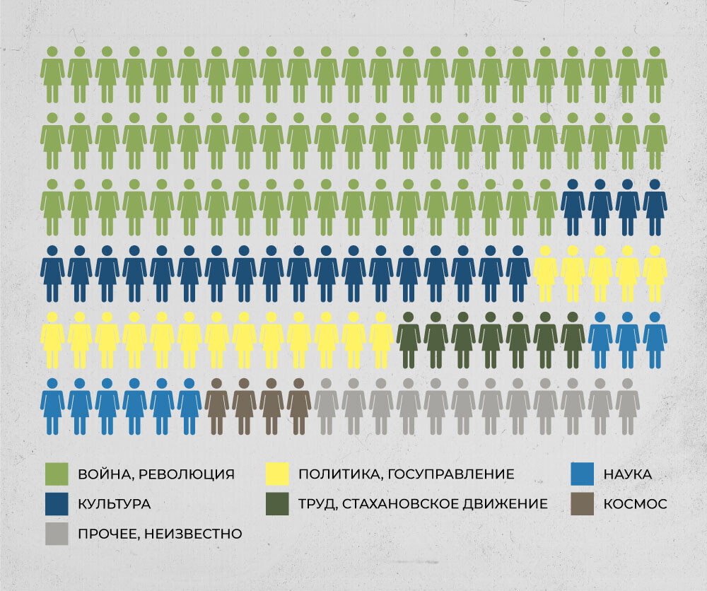 Выборочный подсчет названий вручную в девяти городах России подтверждает гипотезу о военно-революционном перекосе в «женской» топонимике: 47 процентов наименований связаны с именами летчиц, подпольщиц, партизанок, разведчиц, медсестер, связисток и радисток, а также революционерок, в том числе террористок вроде Розалии Землячки, Веры Фигнер или Софьи Перовской. Одно из самых распространенных «женских» названий — в честь Зои Космодемьянской, красноармейки и разведчицы, одной из первых женщин, удостоенных звания Героя Советского Союза во время Великой Отечественной войны. Ее имя носят пять сотен улиц в России.