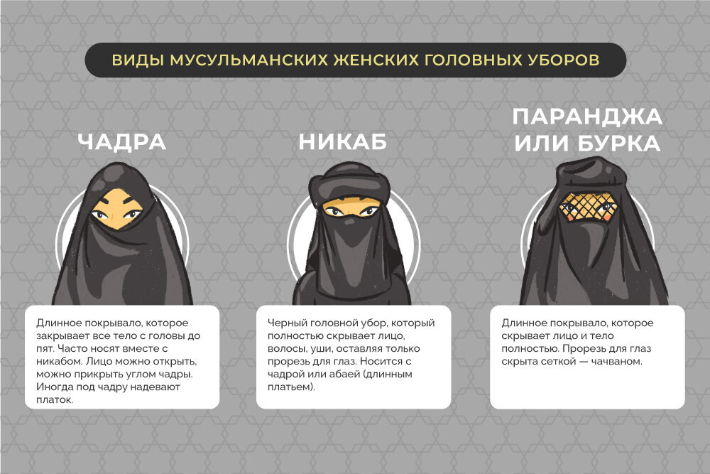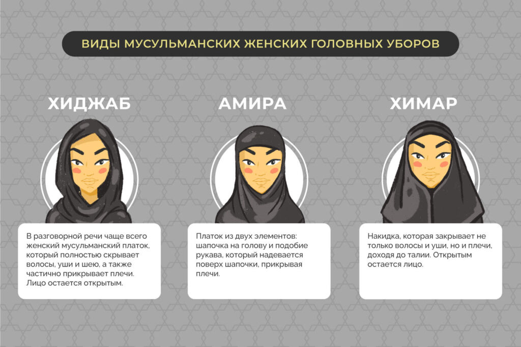 В определении хиджаба как формы одежды есть разночтения, но, пожалуй, наиболее распространено такое: хиджаб — это особенным образом повязанный головной платок, полностью скрывающий волосы. Более строгий вариант — хиджаб амира, покрывающий также плечи, и химар, скрывающий и переднюю часть груди. Следующий уровень — чадра или чаршаф, одеяние полностью скрывает тело, а также нижнюю часть лица. Дальше идет никаб — эта одежда прячет лицо, оставляя лишь узкую прорезь для глаз. Самый радикальный вариант — паранджа или бурка, почти чехол, закрывающий все, включая глаза (они скрываются за сеткой).