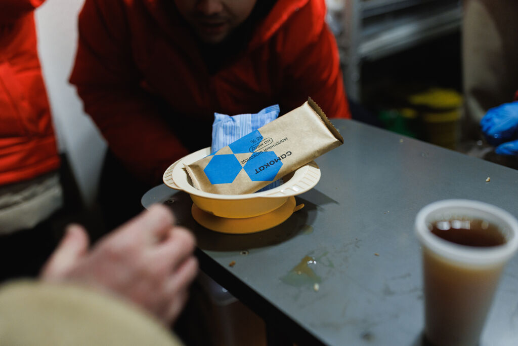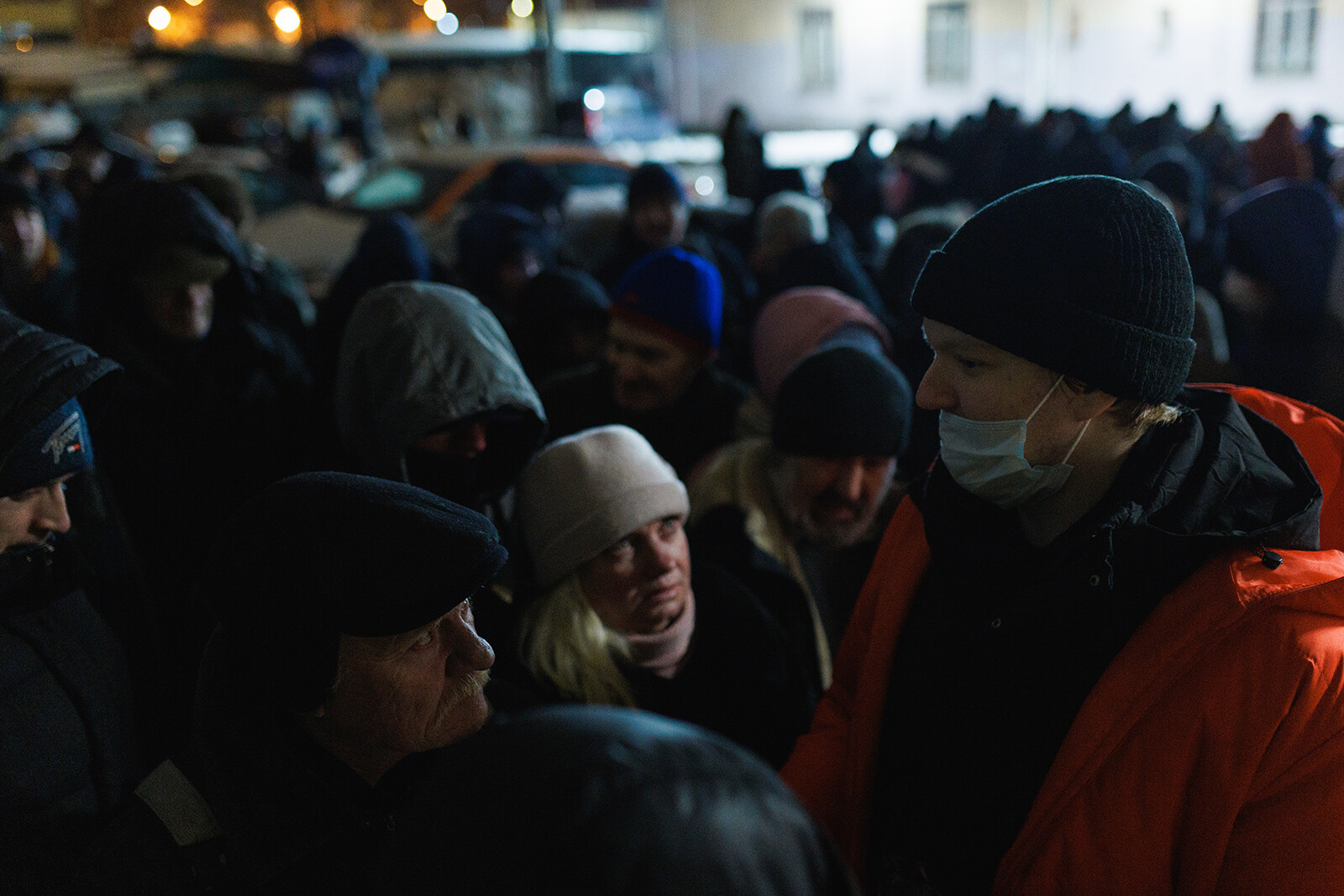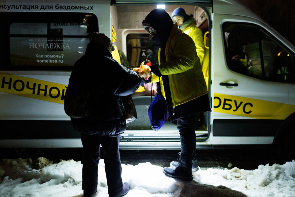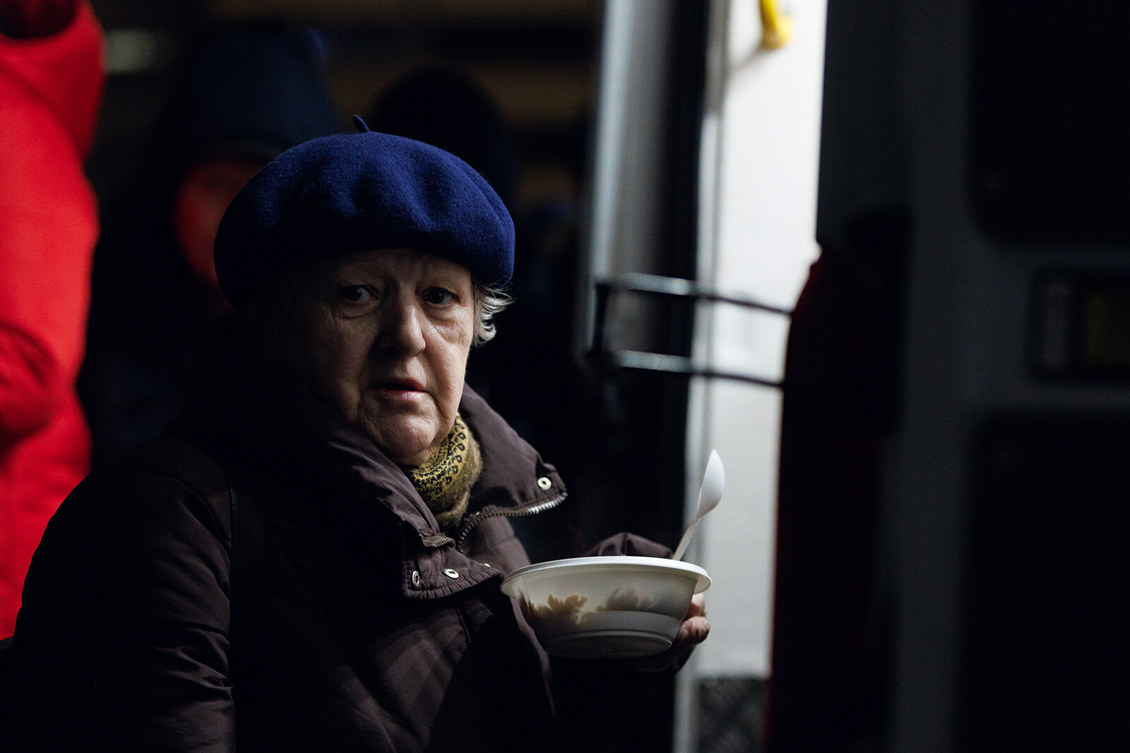 «Ночной автобус» останавливается на пустыре недалеко от железной дороги, и волонтеры начинают выдавать бездомным миски с горячей едой и хлеб. Худощавая Ирина в пуховом платке ест суп, отвернувшись от толпы. Она дрожит от ветра.