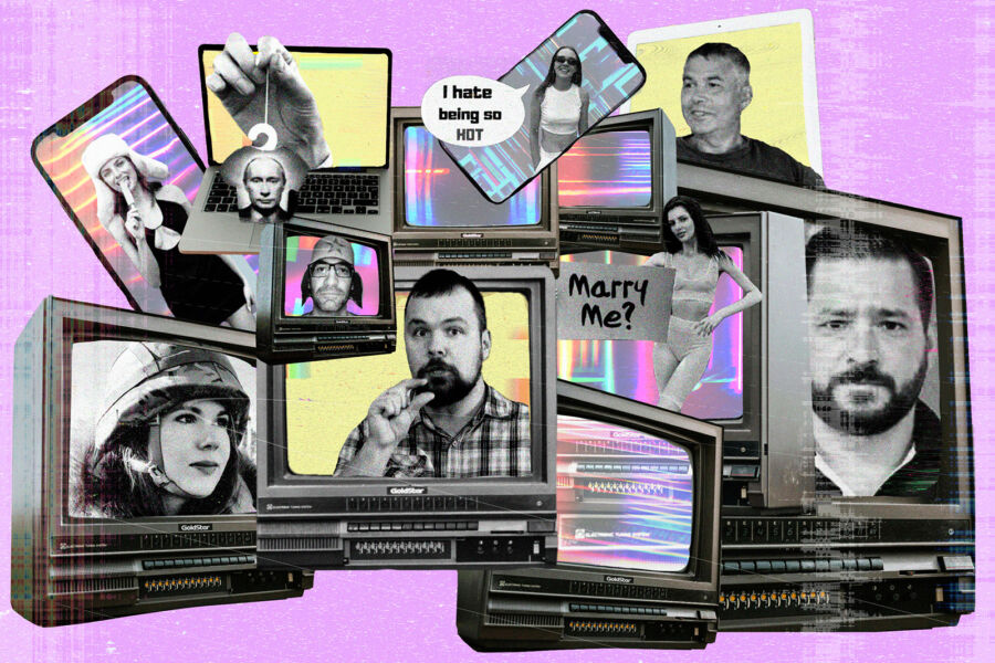 Кликбейтные названия роликов дополняют вуайеристские обложки в духе male gaze. «Ненавижу быть такой горячей», — гласит облако-выноска на фото девушки модельной внешности в коротком топе. Это обложка видео с уличными интервью на тему «Что русские ненавидят в своей жизни», но такого ответа в ролике нет.