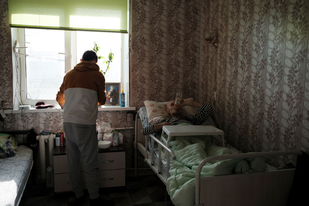 Напротив комнаты, где, несмотря на запреты, уютно расположился шкода Черныш, живут два пожилых человека — Сергей и Александр. Первый может пройти буквально пару шагов, второй не встает с кровати: у него рак. На полу лежит пакет с мочой, трубка скрывается под одеялом.