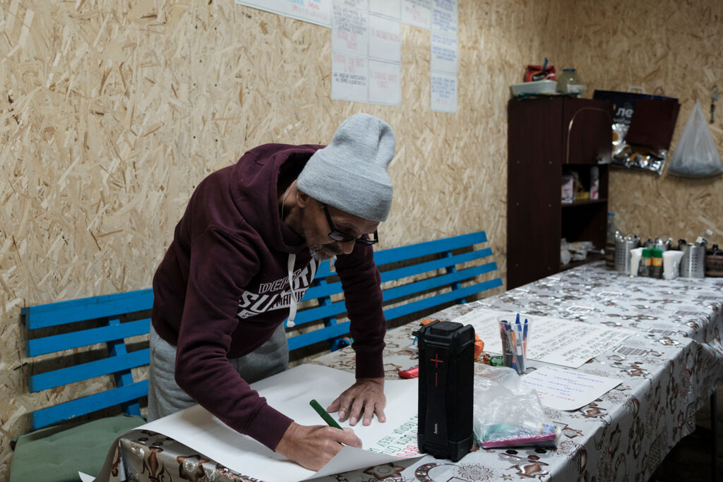 В «Доме-приюте» он стал заниматься своего рода миссионерством: пишет тексты молитв, 10 заповедей из Ветхого Завета и заповеди блаженства из Нового Завета, а потом вешает эти плакаты на стену в кухне-трапезной.
