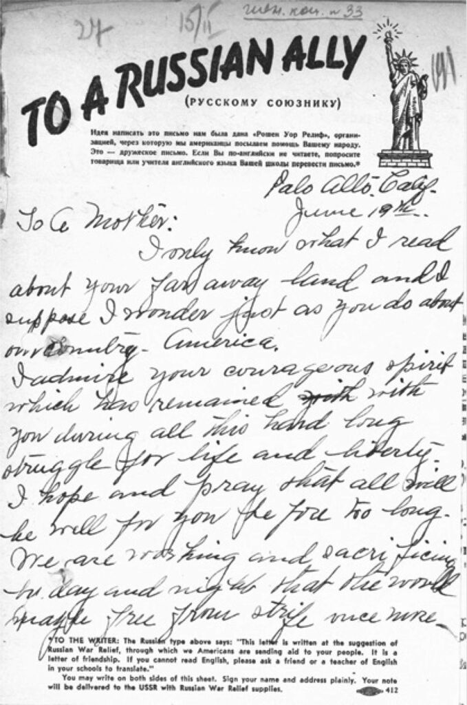 Преисполненные чувствами американки отправляли письма и почтовые открытки в Советский Союз — и в качестве адресата обычно писали «Женщине, в Россию», «В Сталинград. Кому-то в России» или просто «Советской женщине». Другие с просьбой найти им кого-либо для переписки даже обращались в посольство СССР в Вашингтоне и консульство в Нью-Йорке.