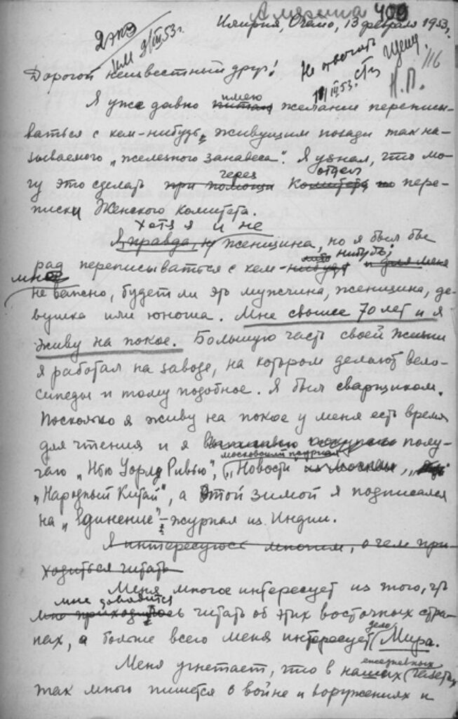 «Дорогая Ирина, позавчера я получила ваше письмо и была так счастлива. Я уже было подумала, что вы не получили мой ответ или, возможно, это правда, [что] ваше правительство не хочет нашей переписки из-за этой отвратительной “холодной войны”, о которой пишут в газетах» — так начиналось послание, которое 1 декабря 1948-го отправила из США в Советский Союз 46-летняя Миртл Парк.
