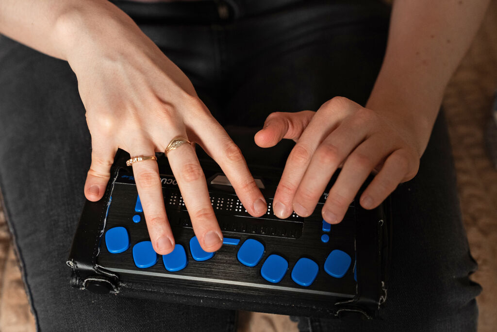Разница лишь в том, что в руках у Алены — брайлевский дисплей, с помощью которого она общается и работает. Это устройство похоже на клавиатуру с джойстиком, только вместо букв — точки азбуки Брайля. С 2022 года такие дисплеи выдают людям старше шести лет с инвалидностью по зрению, но Алене его подарил отчим еще 12 лет назад, когда девушке было 14.