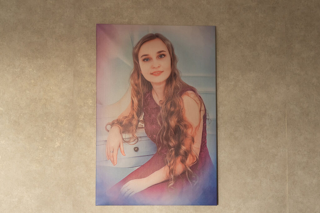 Молодая мать сидит на диване. Они с ребенком дома одни, папа малыша Исломиддин придет только поздно вечером. На стене над диваном висит парадный портрет Алены в розовых тонах: уверенная поза, улыбка, длинные светлые локоны. Реальность не столь нарядна, зато напоминает жизнь матерей по всему миру: простая и удобная домашняя одежда, на коленях — младенец.