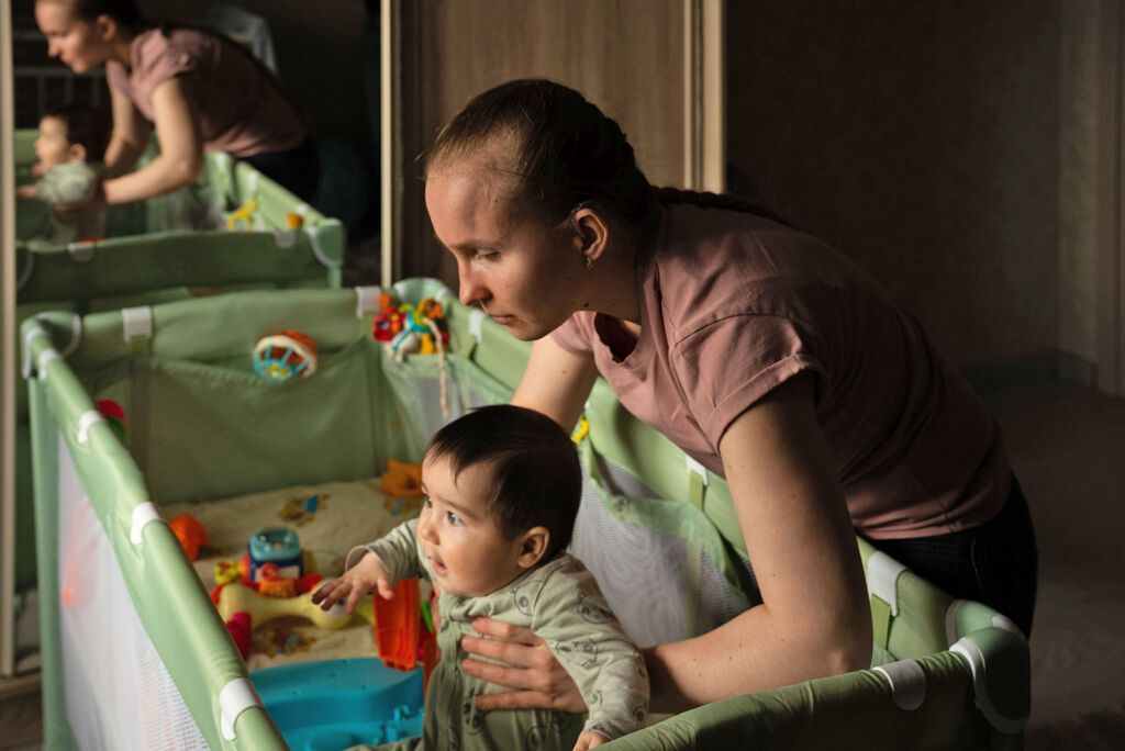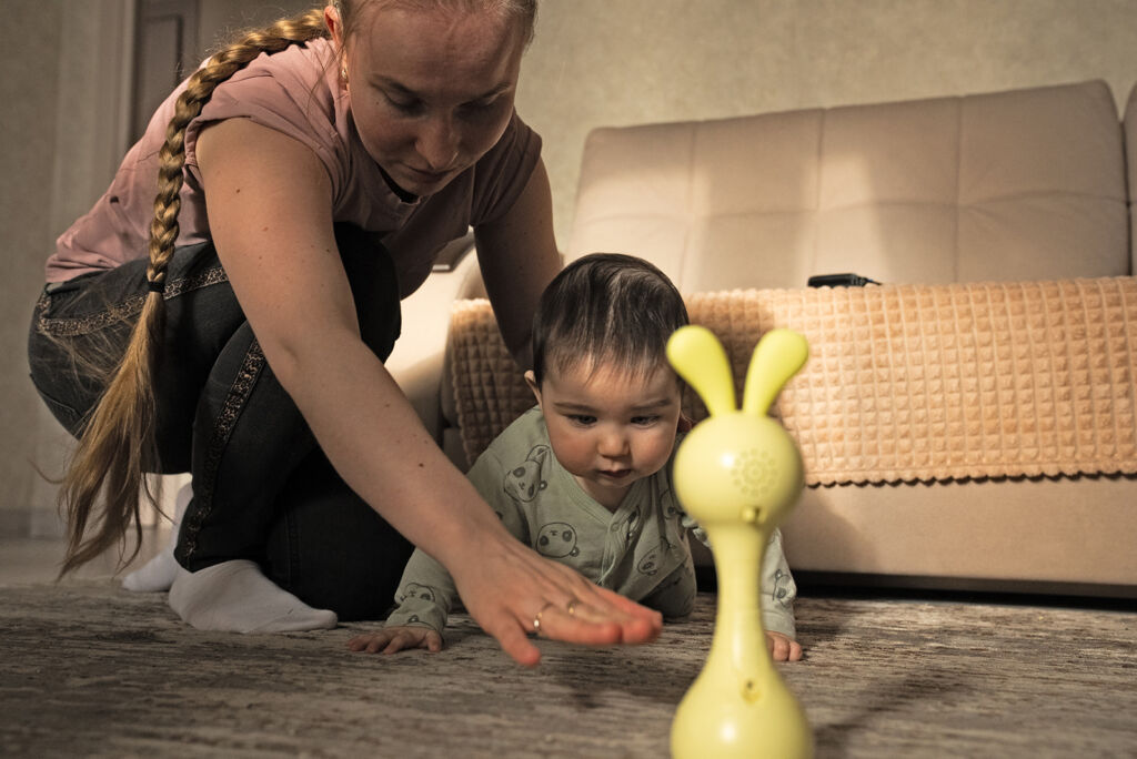 Руслан, которому нет и года, с интересом наблюдает, как мама насыпает в бутылочку четыре ложки смеси без горки (проверила пальцем), заливает водой, перемешивает и привычным движением ставит в микроволновку. Алена кормит сына грудью и с ложечки: упираясь одним пальцем в лоб, а другим — в щеку малыша, она безошибочно определяет, где ротик.